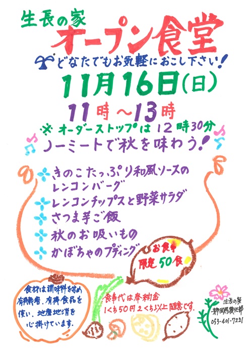 11月16日(日)はオープン食堂を静岡教区3会場同時開催致します。 各会場工夫を凝らして地産地消で準備しております。 みなさまのお越しをお待ちしております。 美味しいご飯を食べて笑顔になりませんか?