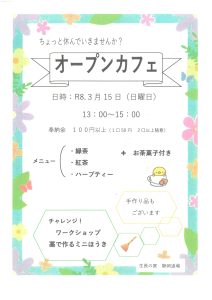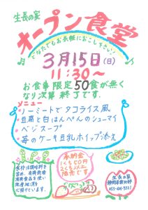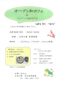 3道場同時開催! *教化部会館 オープン食堂 11時30分~ 50食 *静岡道場 オープンカフェ 13時~15時 ワークショップも開催 *伊豆長岡道場 オープンカフェ 10時~12時 ミニイベントも開催 皆さんお誘い合わせの上お越しください。 お待ちしております